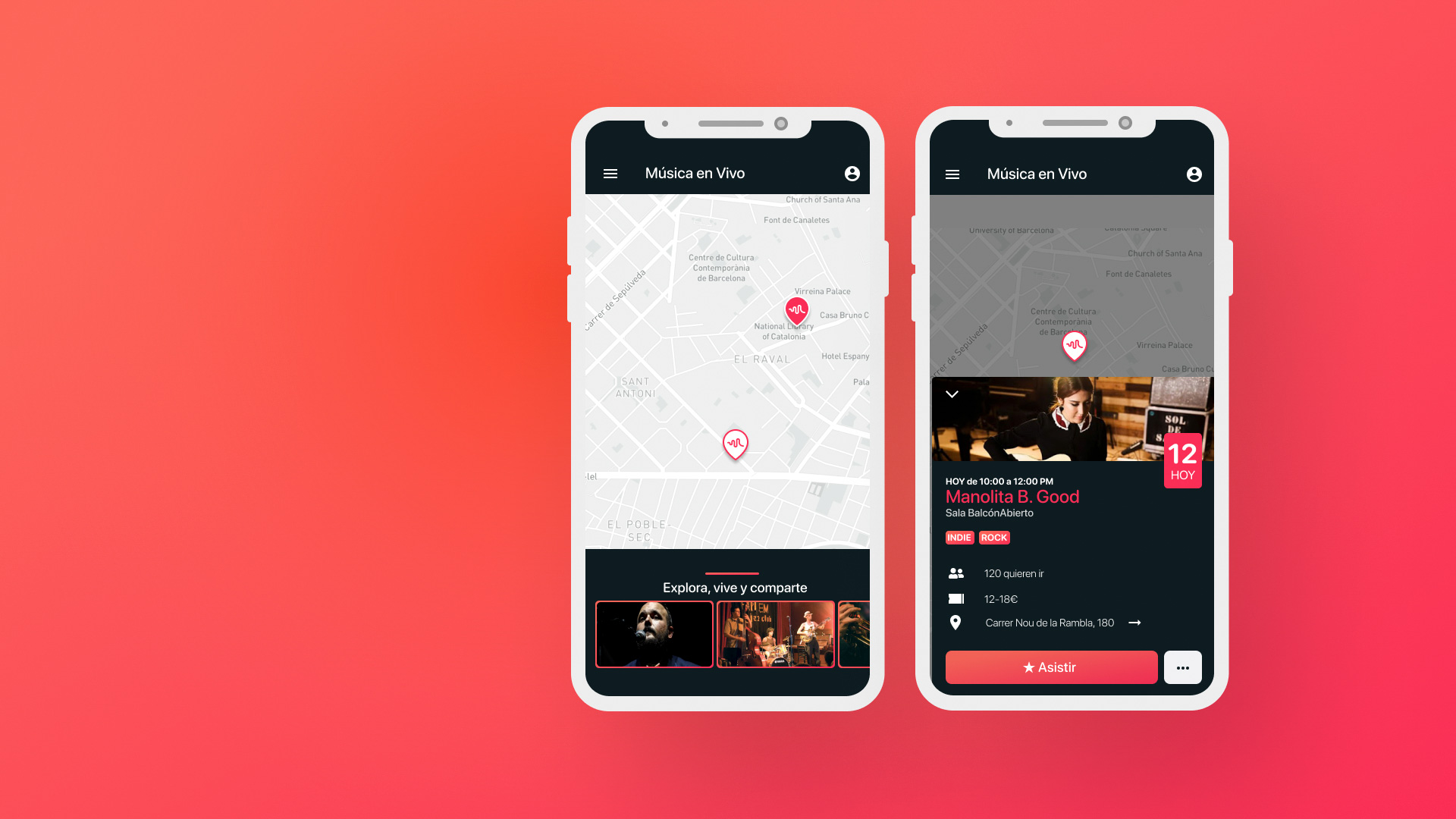 The idea of creating an app arose after a meeting between friends in Barcelona. They decide to go listen to live music, but they don't know how to find it easily and quickly.